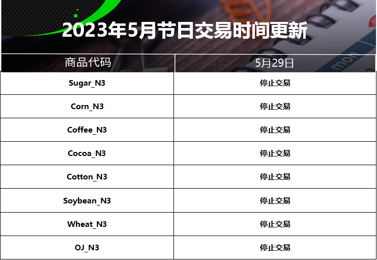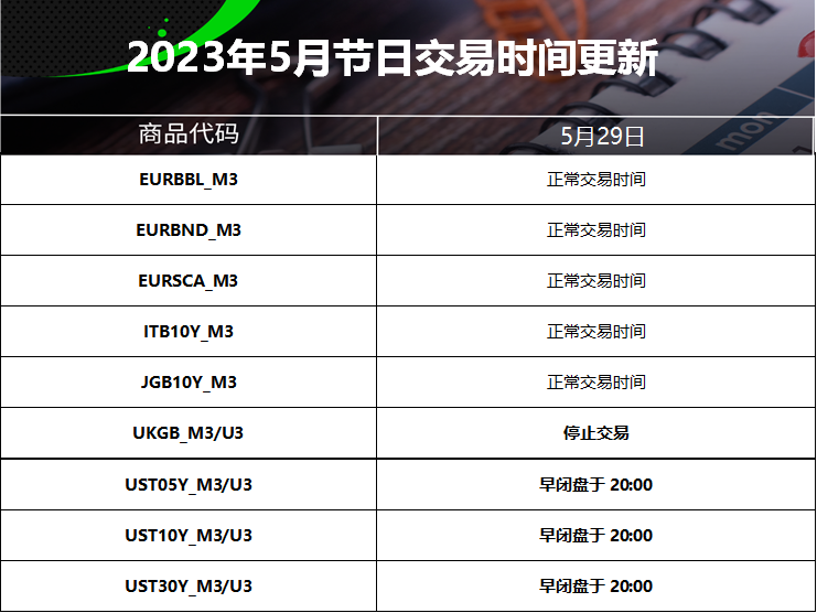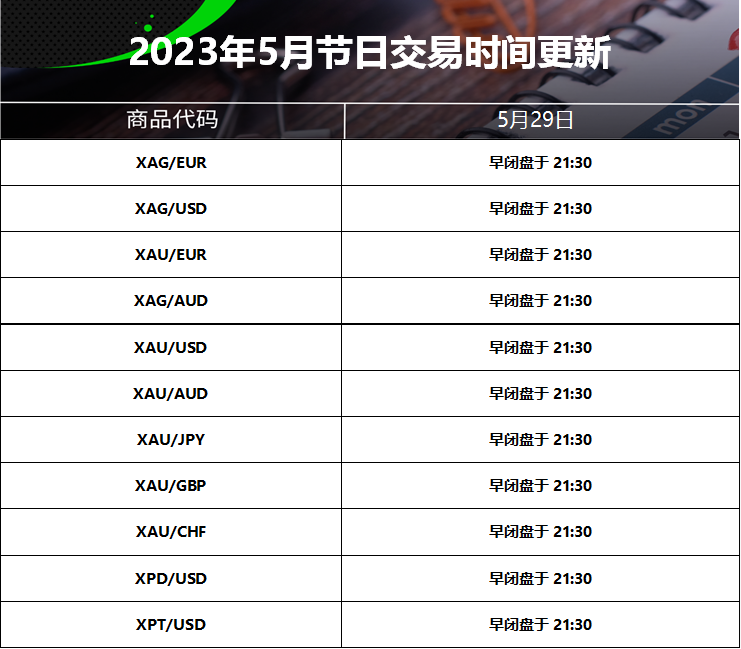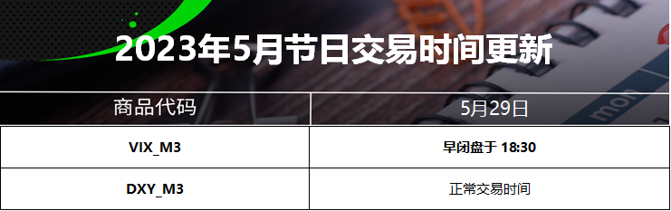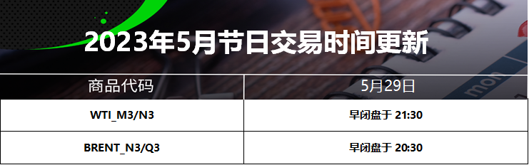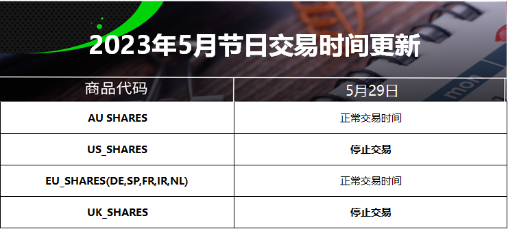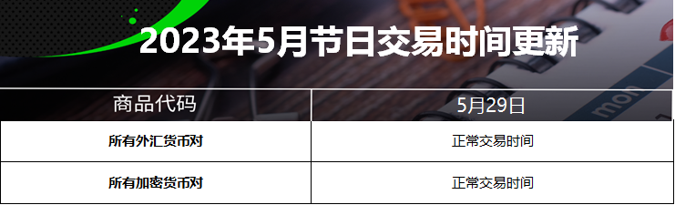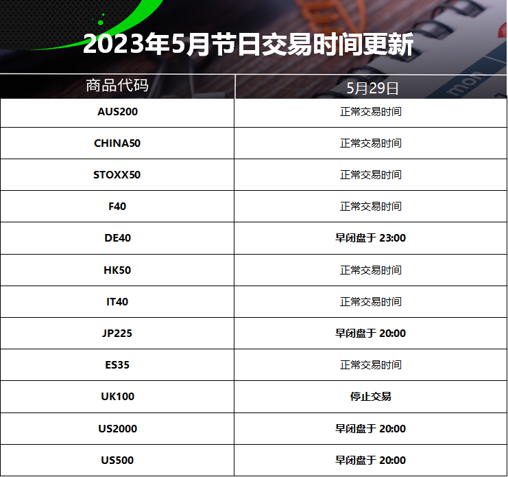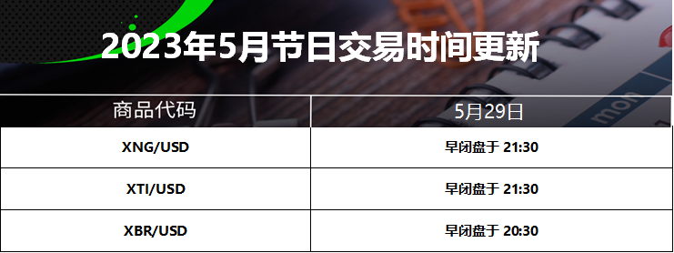 23 May 2023 2023年5月节日交易时间更新(美国阵亡将士纪念日) Chloe Lai No Comments 尊敬的交易者, 请查看我们更新的2023年5月29日的美国阵亡将士纪念日交易时间表 以下提到的所有时间均为平台时间(GMT+3) 外汇货币对/加密货币: 贵金属: 能源现货: CFDs: 能源期货: 软大宗商品期货: 指数期货: 债券期货: 股票: IC Markets Global 中文团队 中文官网: https://www.icmarkets-zco.com Email: support.cn@icmarkets-cs.com 微信:ICM小帮手 微博:@IC小帮手