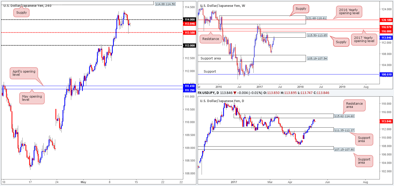 Despite having broken above 114 for a second consecutive time this week, the pair, yet again, failed to sustain gains beyond this number. This could very well have something to do with the weekly candles seen trading from supply marked at 115.50-113.85. However, according to daily structure, the pair may still pop north to a resistance zone coming in at 115.62-114.60. Also noteworthy in this market at the moment is the nearby H4 supply zone drawn from 114.88-114.58. Not only is this base lodged within both weekly supply and the daily resistance area, it also boasts strong downside momentum!