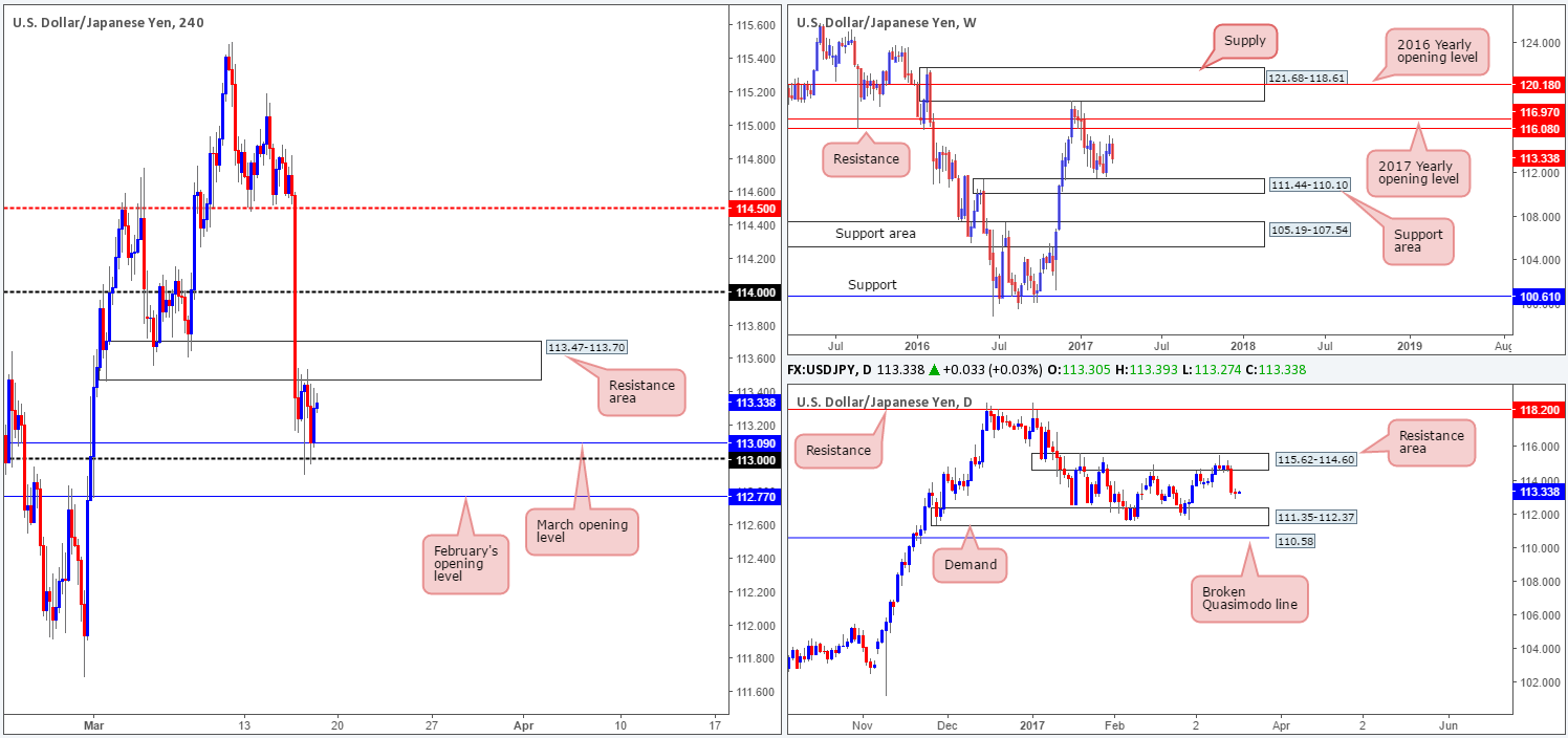 Despite Wednesday’s aggressive selloff, the USD/JPY pair was reasonably lackluster during the course of yesterday’s sessions. Looking at the H4 structure this morning, we can see that the H4 candles are capped between a H4 resistance area 113.47-113.70 and the 1.08 handle/ March opening level at 113.09. Looking over to the bigger picture, both the weekly and daily charts indicate room to extend lower this week. The closest support structure can be seen at 111.35-112.37: a daily demand zone which sits around the top edge of a weekly support area drawn from 111.44-110.10.