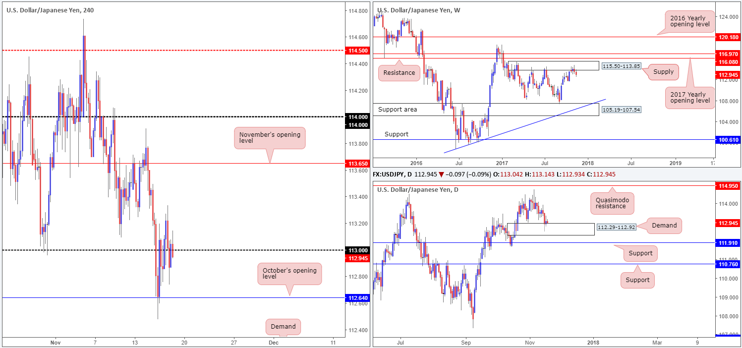 In recent trading, the USD/JPY peaked at 113.33 during the early hours of London, and later whipsawed through the 113 handle to end the day at 113.04. Yesterday’s action, as can be seen on the daily timeframe, printed an inverted hammer candle around the top edge of demand at 112.29-112.92. Although this is considered to be a bullish signal, traders might want to note where price is trading from! On the weekly timeframe, we can see that the bears remain in the driving seat after selling off from supply fixed at 115.50-113.85.