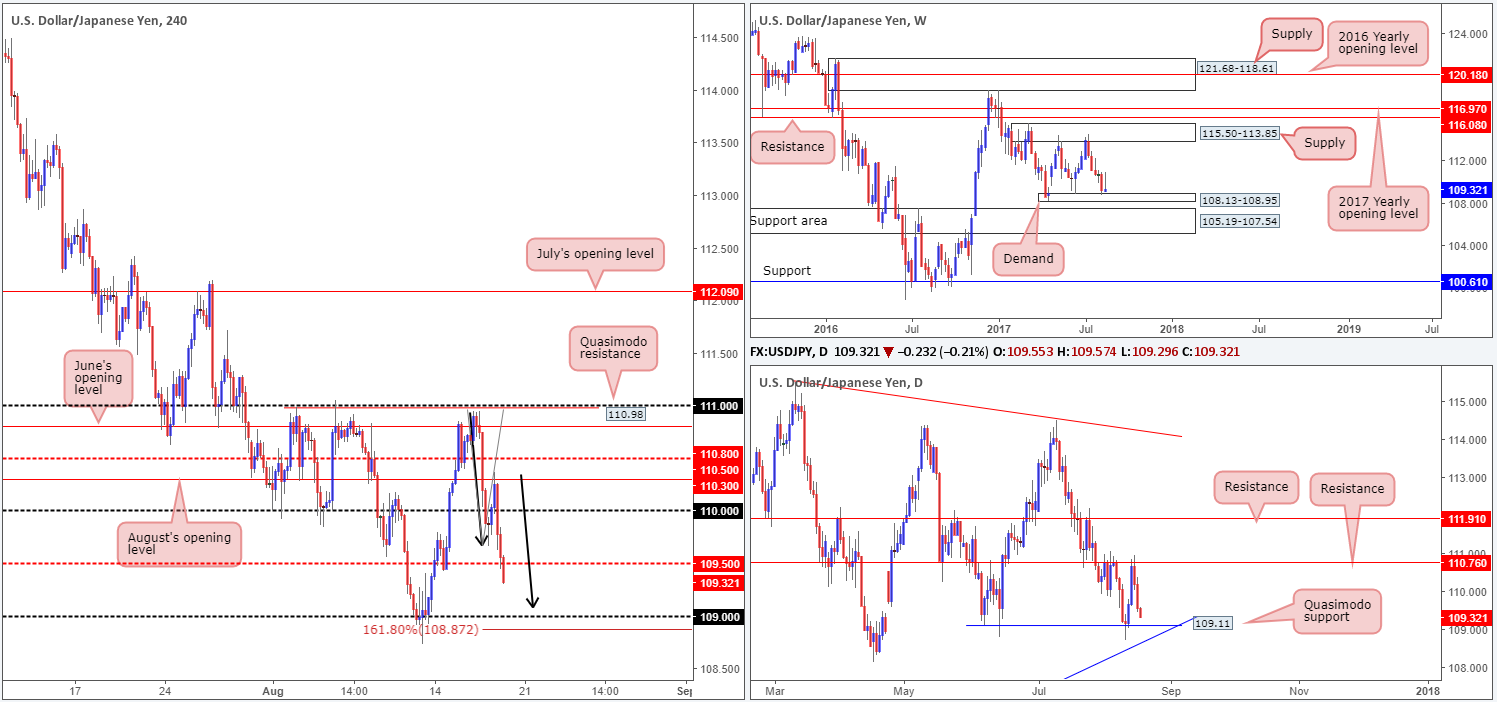 Suggestions: A long from the 109 handle could be an option today, given the H4 approach (AB=CD), daily Quasimodo support and weekly demand. To be on the safe side though, we would highly recommend waiting for a H4 bull candle to form in the shape of a full, or near full-bodied candle. Although this will not guarantee a winning trade, it will show buyer intent!