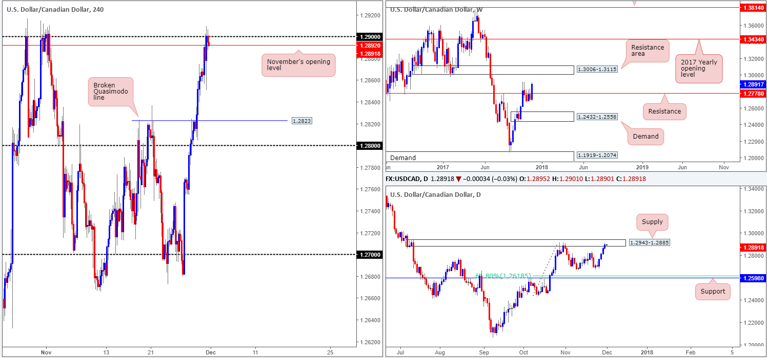 For those who read our previous report you may recall that we underlined the 1.29 handle/November’s opening level at 1.2892 seen on the H4 timeframe as a prospective base to sell from. Our rational behind selecting this area was largely due to the daily supply area seen at 1.2943-1.2885. The only concern here was the fact that weekly price was (and still is) seen trading above weekly resistance at 1.2778, and shows room to advance as far north as the weekly resistance area planted at 1.3006-1.3115.