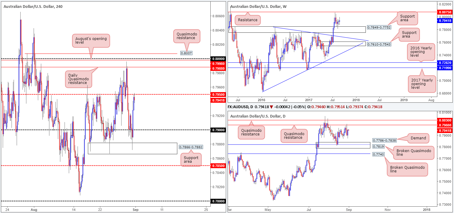 Bouncing over to the H4 timeframe, recent movement shows the commodity currency surpassed the 0.79 handle – tagged fresh buy orders at 0.7866-0.7882 (support area) – and then advanced (likely helped by gold’s advance) back up to the mid-level resistance at 0.7950 by the day’s end.
