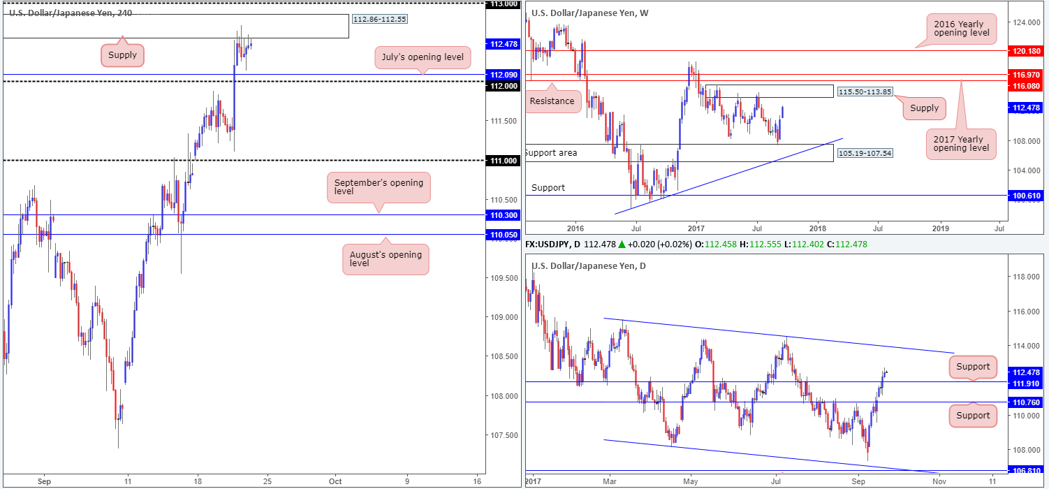 Suggestions: To our way of seeing things, the only barrier bolstering the current H4 supply is the weekly USDX resistance at 11854. Both the weekly and daily charts on the USD/JPY, however, suggest further buying is likely to take place. In addition to this, we have July’s opening level at 112.09, followed closely by the 112 handle lurking just below the current supply! Therefore, we will not be taking shorts in this market right now.