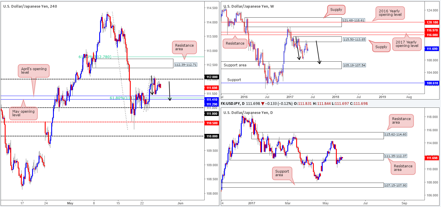 Despite this confluence, the bigger picture shows that the daily candles are seen trading within the confines of a resistance area penciled in at 111.35-112.37. What’s more, we also see weekly action showing room for the unit to trade as low as 105.19-107.54: a support area stretched all the way back to early 2014!