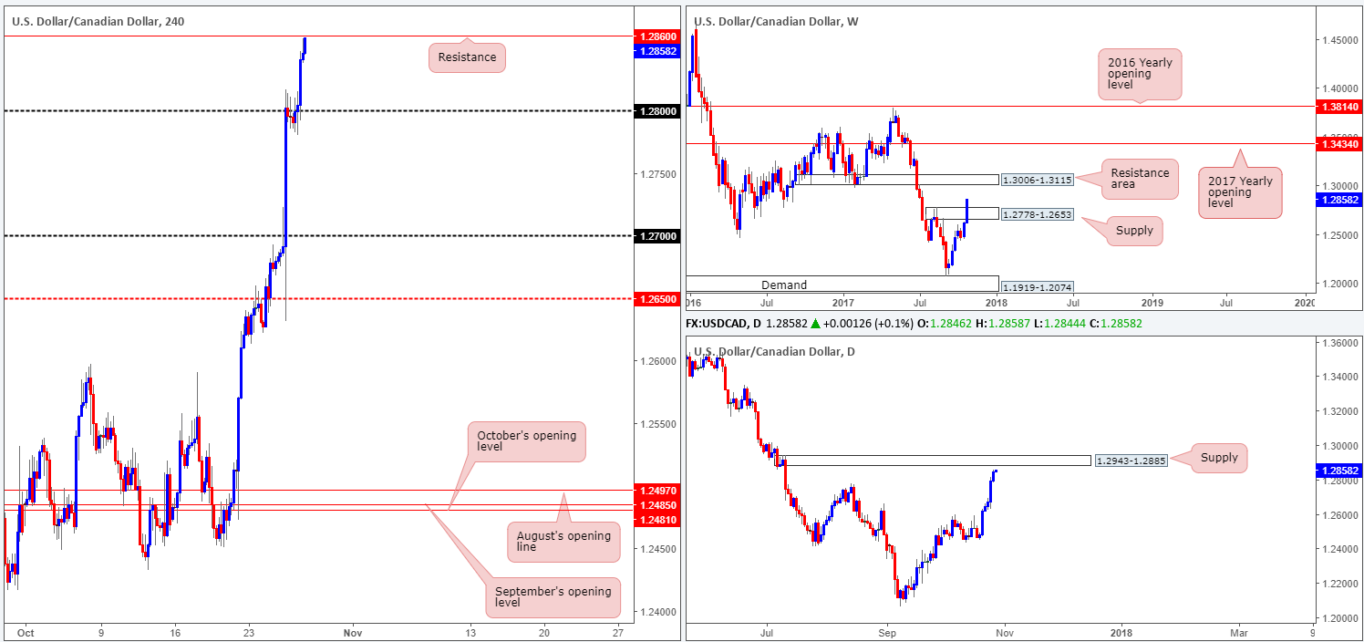 The USD/CAD rallied for a fifth consecutive day on Thursday, up 0.41%. As can be seen from the H4 chart, the 1.28 handle was eventually wiped out which allowed the unit to conclude trading just ahead of a resistance level marked at 1.2860. Between this level and the daily supply seen at 1.2943-1.2885, selling could be an option. The only grumble here, however, is weekly price. Notice that weekly supply at 1.2778-1.2653 was recently taken out, which could, technically speaking, have cleared the path north up to as far as a weekly resistance area at 1.3006-1.3115.