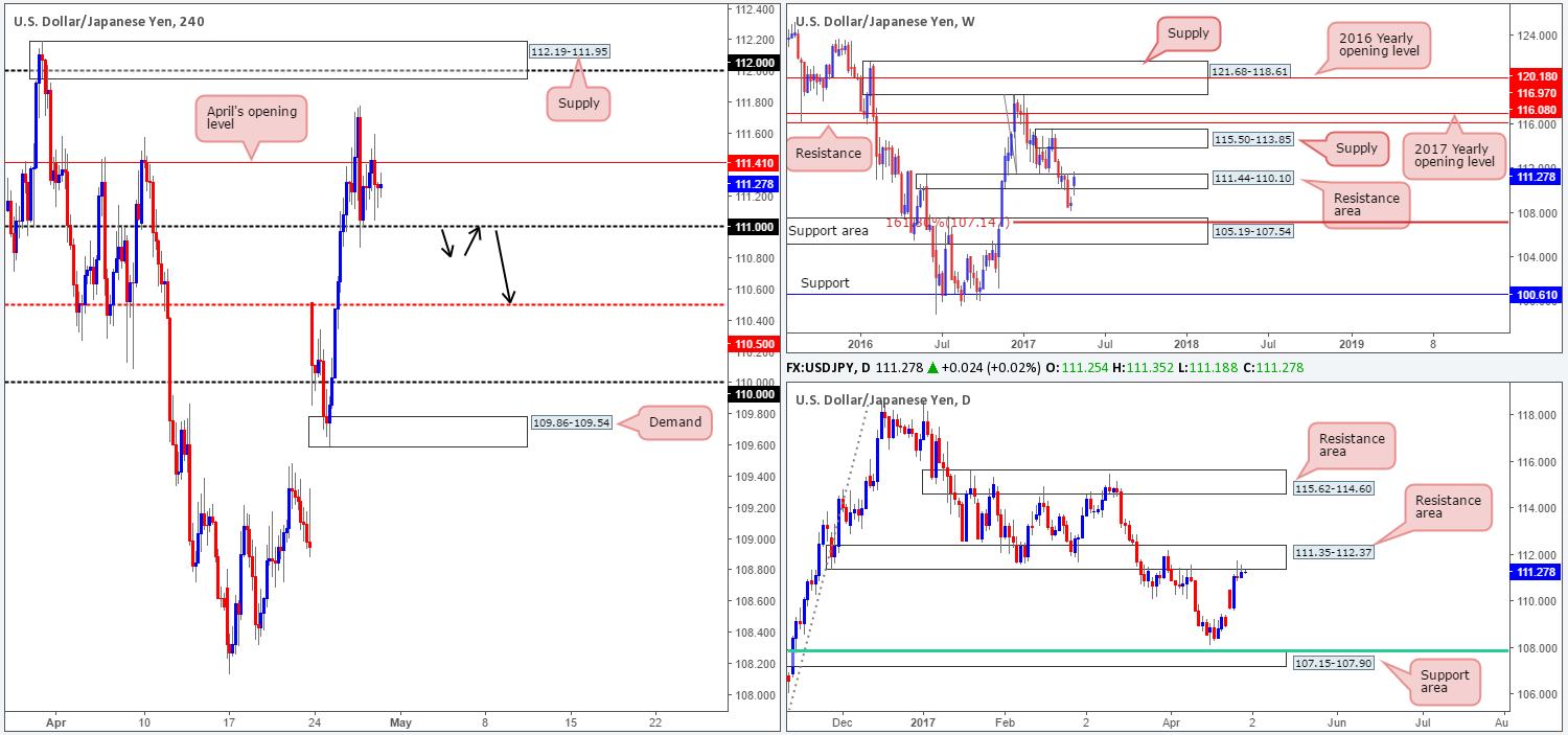 Over the past couple of days, the H4 candles have experienced a considerable amount of choppy action between April’s opening level at 111.41 and the 111 handle. Directly above this range is a supply seen at 112.19-111.95, whereas beyond 111 is a mid-level support seen at 110.50. Aiding the bears at the moment is a weekly resistance area at 111.44-110.10 and a daily resistance area drawn from 111.35-112.37.