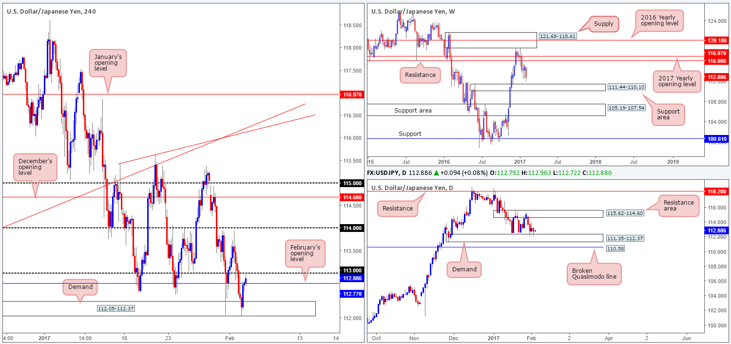 Our suggestions: Wait for a H4 close above the 113 handle to take shape. To our way of seeing things, this would not only further confirm upside strength from the aforementioned daily demand, but also possibly give traders the opportunity to trade any (confirmed) retest seen at 113 as support.