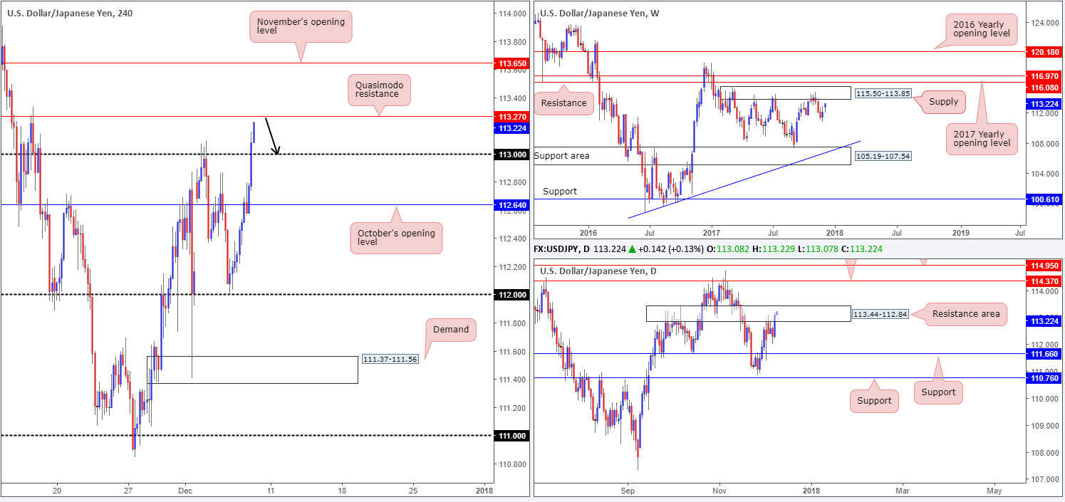 Recent action shows that the USD/JPY extended its bounce from the 112 handle on Thursday, lifting H4 price beyond both October’s opening level at 112.64 and the 113 handle. However, this far from a buyers’ market! Directly up ahead is a mini H4 Quasimodo resistance at 113.27 that’s positioned within the walls of a daily resistance area plotted at 113.44-112.84.
