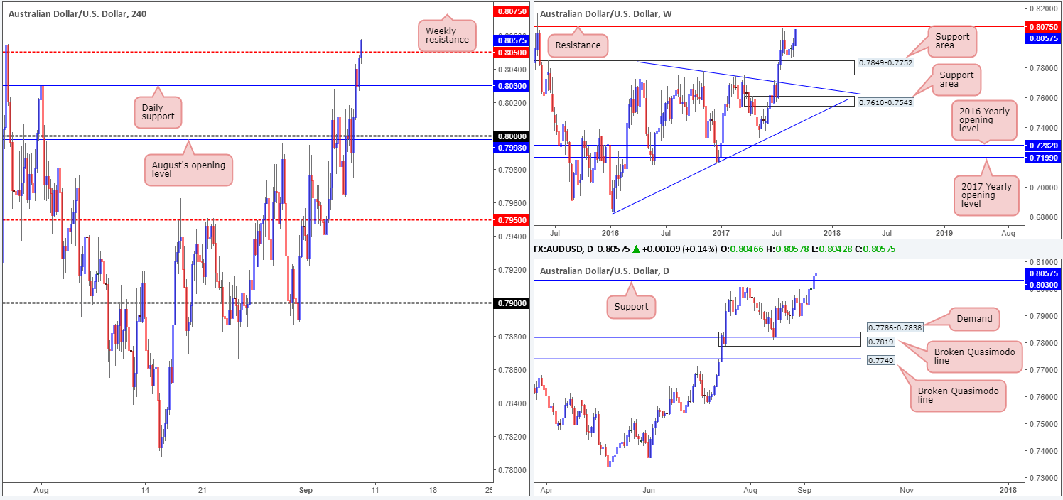Kicking this morning’s analysis off with a look at the weekly timeframe, we can see that the pair’s recent advance has placed the unit within touching distance of resistance pegged at 0.8075. In conjunction with weekly flow, the daily candlesticks also recently crossed above a resistance level positioned at 0.8030, consequently opening up the path north to the noted weekly resistance barrier. Bouncing over to the H4 timeframe, price is, as we write, tackling the mid-level resistance at 0.8050. A decisive push above this number would, technically speaking, open the doors for the unit to greet the aforesaid weekly resistance level.