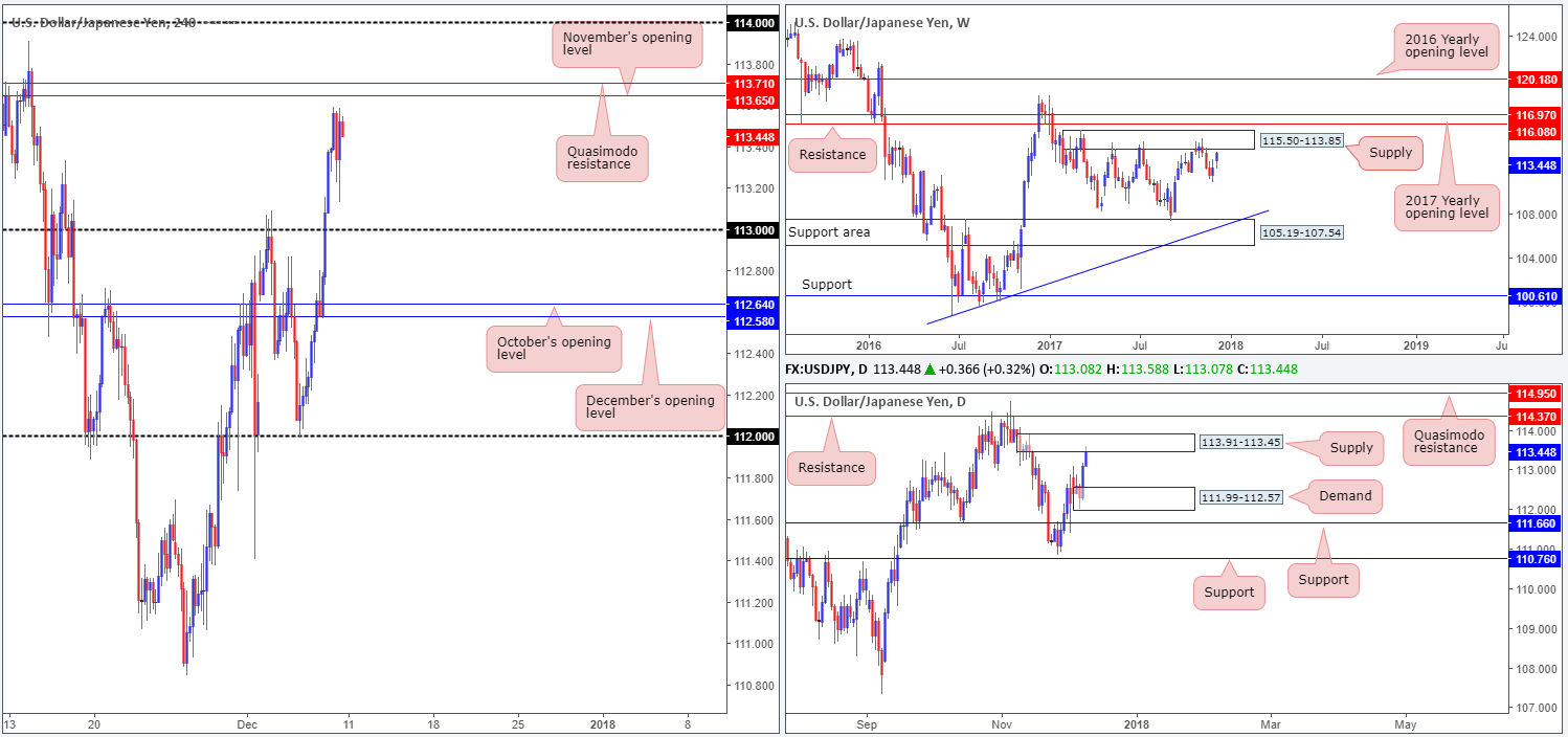 - Short: A sell from 113.71/113.65 (H4 Quasimodo/Nov open line) on the H4 timeframe is, technically speaking, a high-probability reversal zone. Not only do you have a daily supply in motion, one also has a weekly supply bolstering the daily zone! The only problem is stop-loss placement. Setting stops above the current daily supply is appealing, but then you’re potentially opening yourself up to a fakeout up to the round number seen at 114! A healthy rotation from the H4 barriers, however, could target the 113 handle and quite possibly the daily demand base seen at 111.99-112.57 (positioned nearby December/October’s opening levels on the H4 timeframe at 112.58/112.64).
