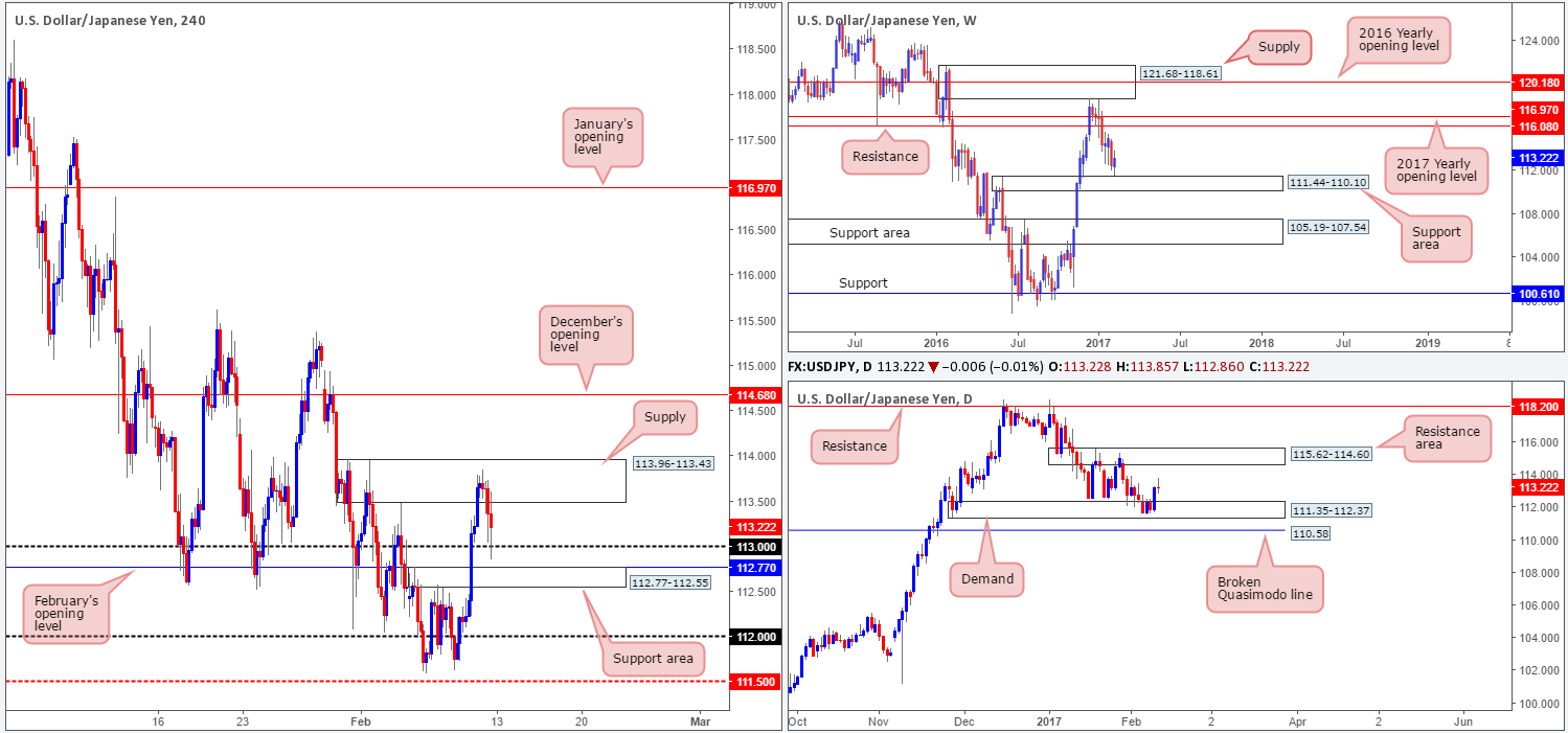 Looking at Friday’s action on the H4 chart, we can see that the unit was incapable of sustaining gains beyond the H4 supply zone at 113.96-113.43, resulting in price trading back down to the 113 psychological handle into the closing bell. In light of the bigger picture (see above) we do not envisage the H4 candlesticks pushing beyond the H4 support area at 112.77-112.55 this week. In spite of this, we have no intention of becoming buyers in this market until the current H4 supply area is consumed.