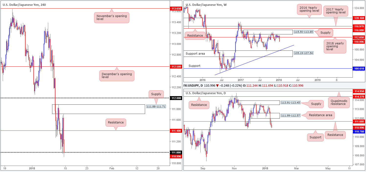 A brief look at recent dealings on the H4 timeframe reveals that the 111 handle remains in play, despite an earnest attempt on the sell side to breach this number in the later hours of Friday’s US segment. If 111 is consumed today/this week, then the H4 mid-level support at 110.50 will likely be the next port of call on the this scale. That is, assuming the daily bears can penetrate daily support at 110.76 first!
