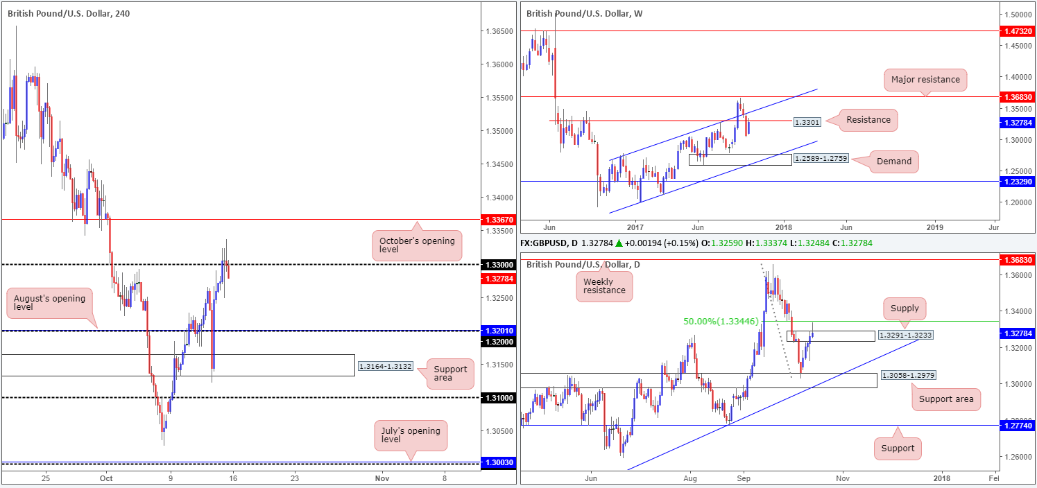 On the daily timeframe, GBP/USD bulls chalked up five consecutive bullish candles last week. Despite this, Friday’s candle formed a strong-looking bearish selling wick (pin bar) that pierced through the top edge of supply at 1.3291-1.3233, and came within a few pips of plugging into a 50.0% resistance value pegged at 1.3344 taken from the high 1.3655.
