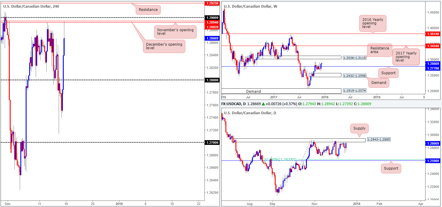 A brief look at recent dealings on the H4 timeframe shows that after the H4 candles chalked in a session low of 1.2739 amid the early hours of London, the unit switched course and turned northbound. Aided by disappointing Canadian manufacturing sales, the pair eventually crossed above the 1.28 handle and shook hands with December and November’s opening levels seen at 1.2894/1.2892 into the close.