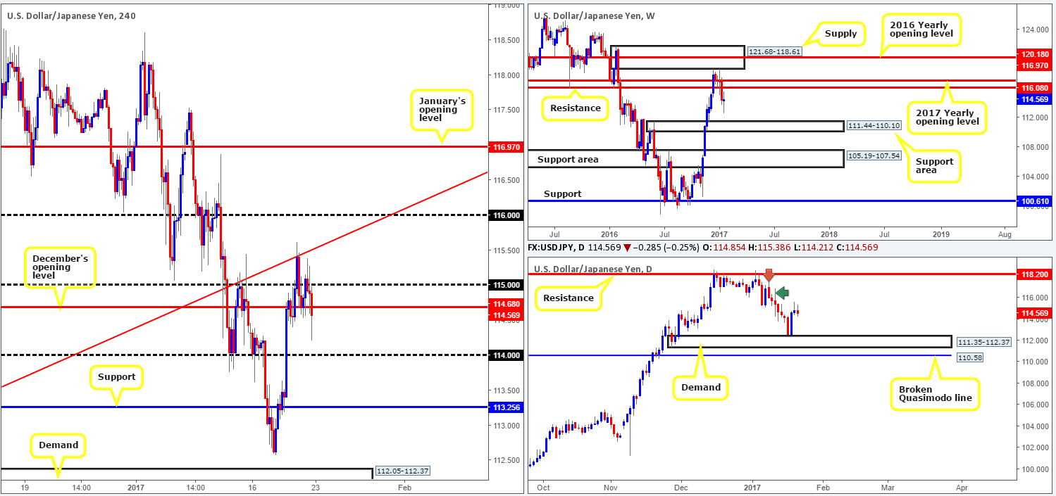 Analyzing Friday’s sessions on the H4 chart shows that the pair failed to muster enough strength to sustain gains beyond the 115 handle. Trump’s inauguration and speech did little to upset the markets, causing price action to marginally selloff and wipe out December’s opening base at 114.68.