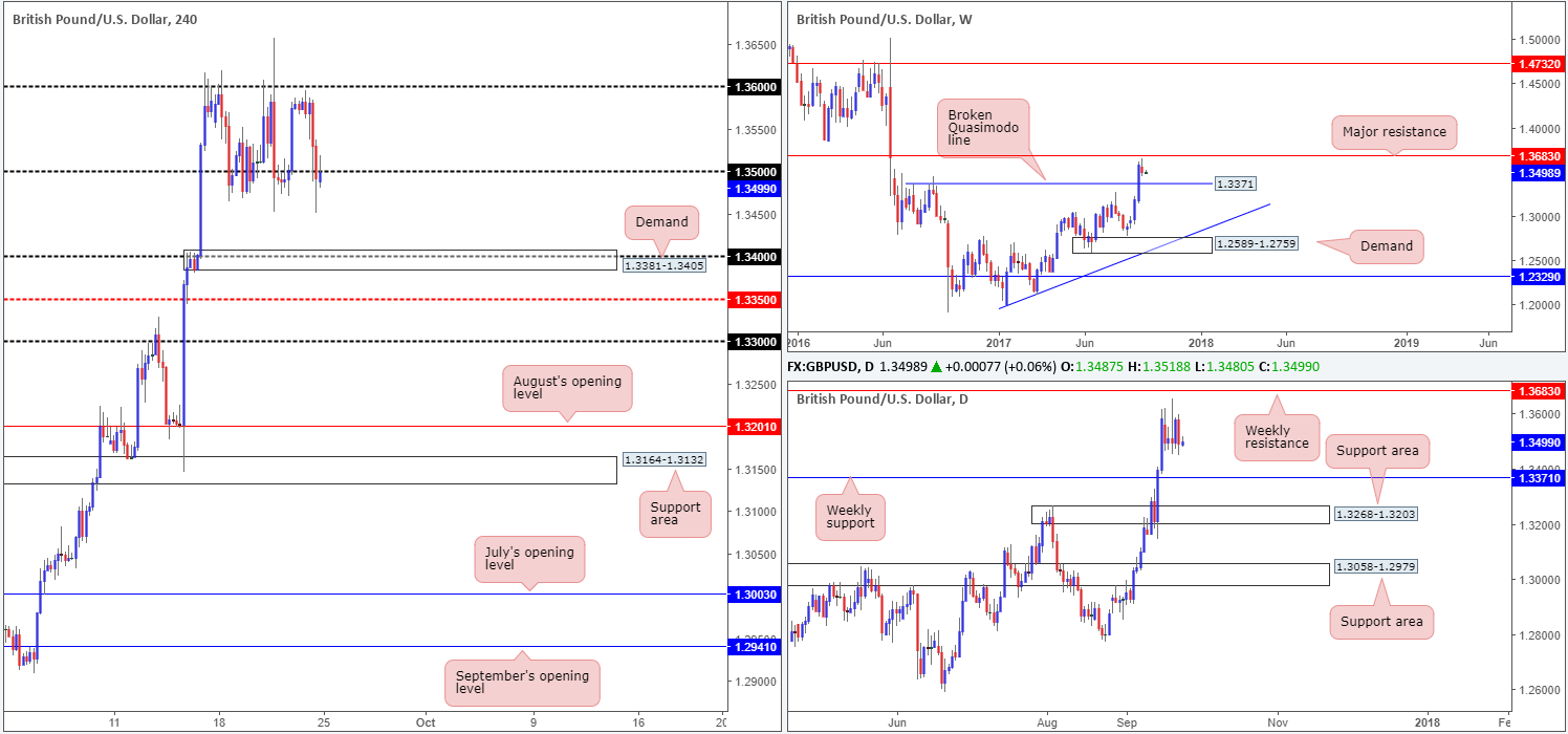Suggestions: Put simply, with USDX weekly sellers trading from resistance at 11854, and GBP weekly chart showing room to advance as far as resistance at 1.3683, we may see buyers make an appearance this week. For now, however, the desk is going to continue watching H4 price action around the 1.35 boundary. Should a full, or near-full-bodied bearish candle take shape beneath here, a short could be an option down to 1.34ish.