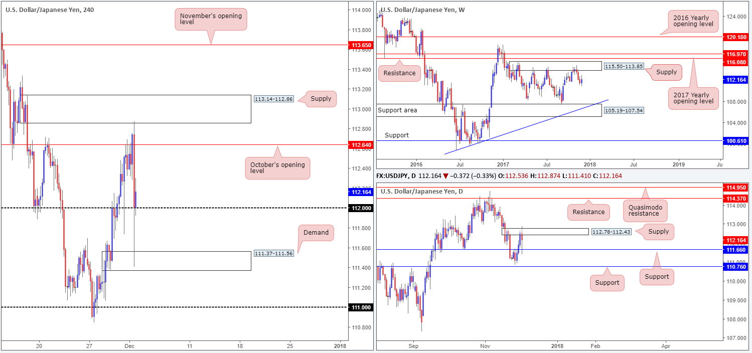 A brief look at recent dealings on the H4 timeframe reveals that the candles whipsawed above October’s opening level at 112.64 and crossed swords with the underside of a H4 supply base at 113.14-112.86. Shortly after, the pair fell sharply after reports emerged that Michael Flynn, Trump’s former national security advisor, will testify against Trump. The 112 handle suffered a nasty whipsaw in response, with H4 price only finding refuge once connecting with H4 demand pegged at 111.37-111.56.