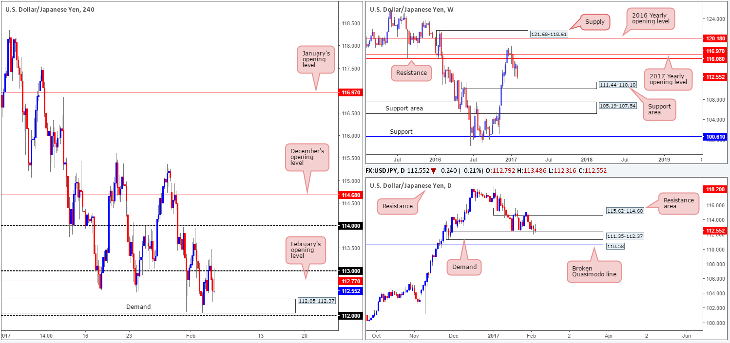 Our suggestions: 1.2427 is a noteworthy area of support, in our opinion. Not only is it housed within the lower limits of the daily support area at 1.2510-1.2415, it’s also seen in close proximity to the 1.24 handle and H4 trendline support drawn from the high 1.2432 (yellow zone). The only grumble we have concerning a buy trade from here is that weekly price, as mentioned above, looks as though it wants to cross swords with the 2017 yearly opening level, which is located around the top edge of daily demand at 1.2252-1.2342. So, there is a chance that price may ignore our pre-determined H4 buy zone!