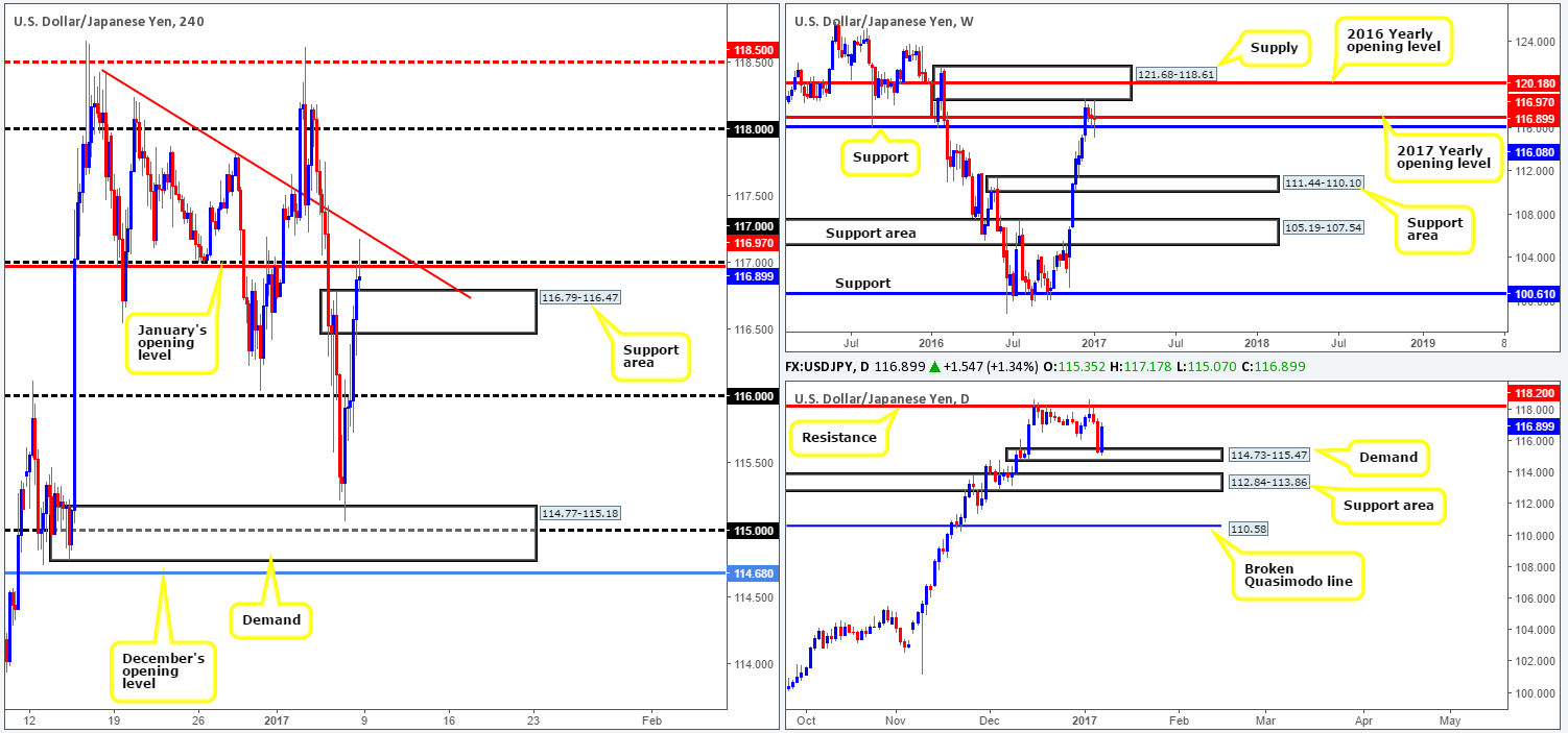 Our suggestions: Given the H4 bearish selling wick seen piercing through both January’s opening level at 116.97/117 handle, which also came within an inch of connecting with a H4 trendline resistance taken from the high 118.40, one may consider selling this market today. There are, nevertheless, two cautionary points to consider. Firstly, directly below current price we have a H4 support area at 116.79-116.47, and secondly, let’s not forget that daily action recently bounced from a daily demand area (see above). As such, from our perspective, shorting this market is just too risky at this time. Buying on the other hand could be something to consider following a H4 close beyond the aforementioned H4 trendline resistance, as the path north appears relatively clear thereafter up to the 118 barrier.