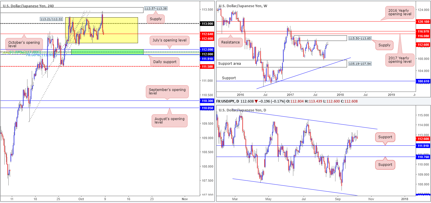 The dollar, as you can see on H4 timeframe, moved higher in the immediate aftermath of Friday’s job’s report, breaking out of its current range at 113.21/112.32 and testing nearby supply at 113.57-113.38, which held firm. The push lower from the area was aggressive, almost immediately reclaiming NFP-induced gains and closing the day marginally below October’s opening level at 112.64.