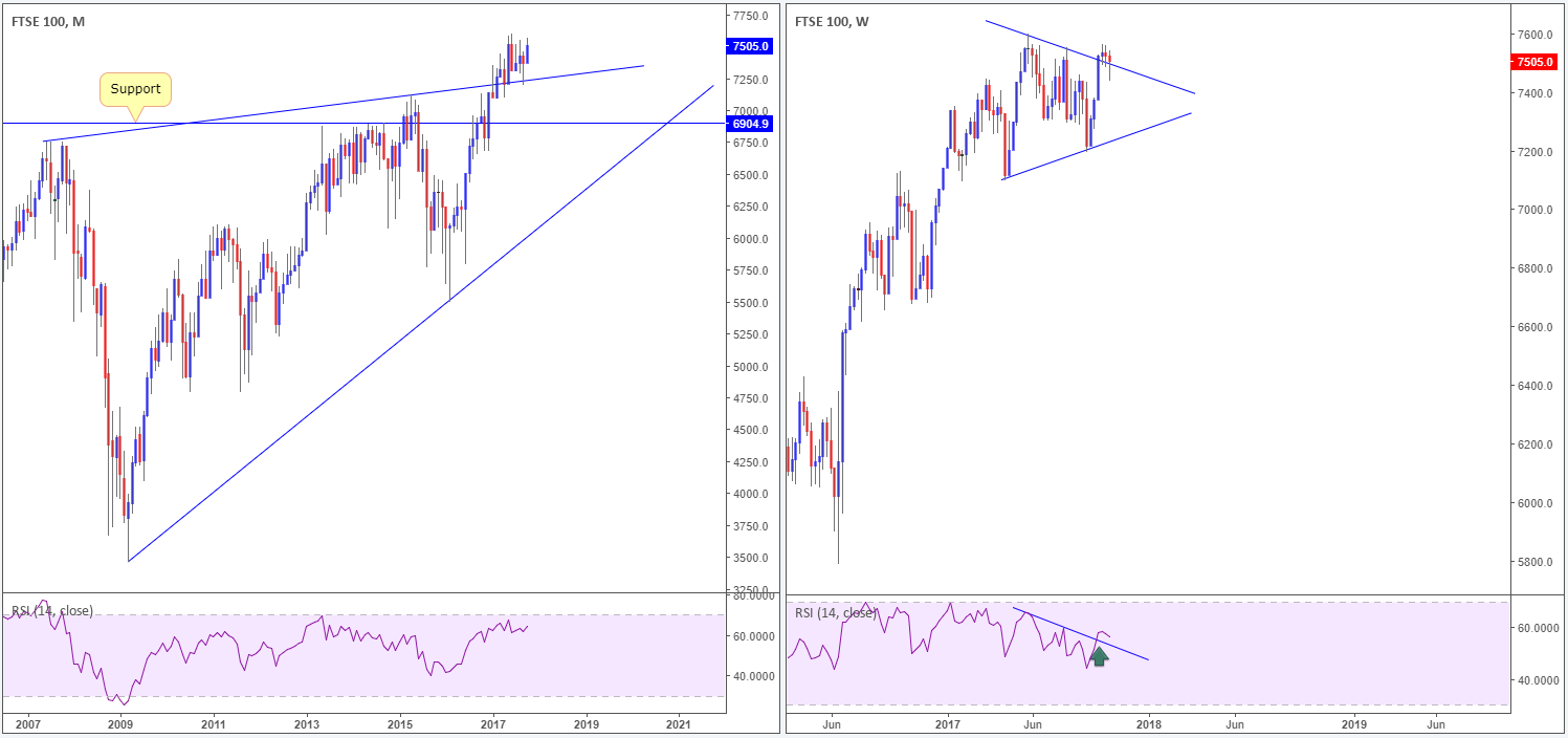 Monthly technicals show price recently bounced off a trendline support etched from the high 6754.1, with little resistance in view. In support of this, weekly price is also seen reinforced by the top edge of a recently broken pennant taken from the high 7599.0. Also important on this scale is the RSI trendline break (green arrow) and last week’s buying tail.