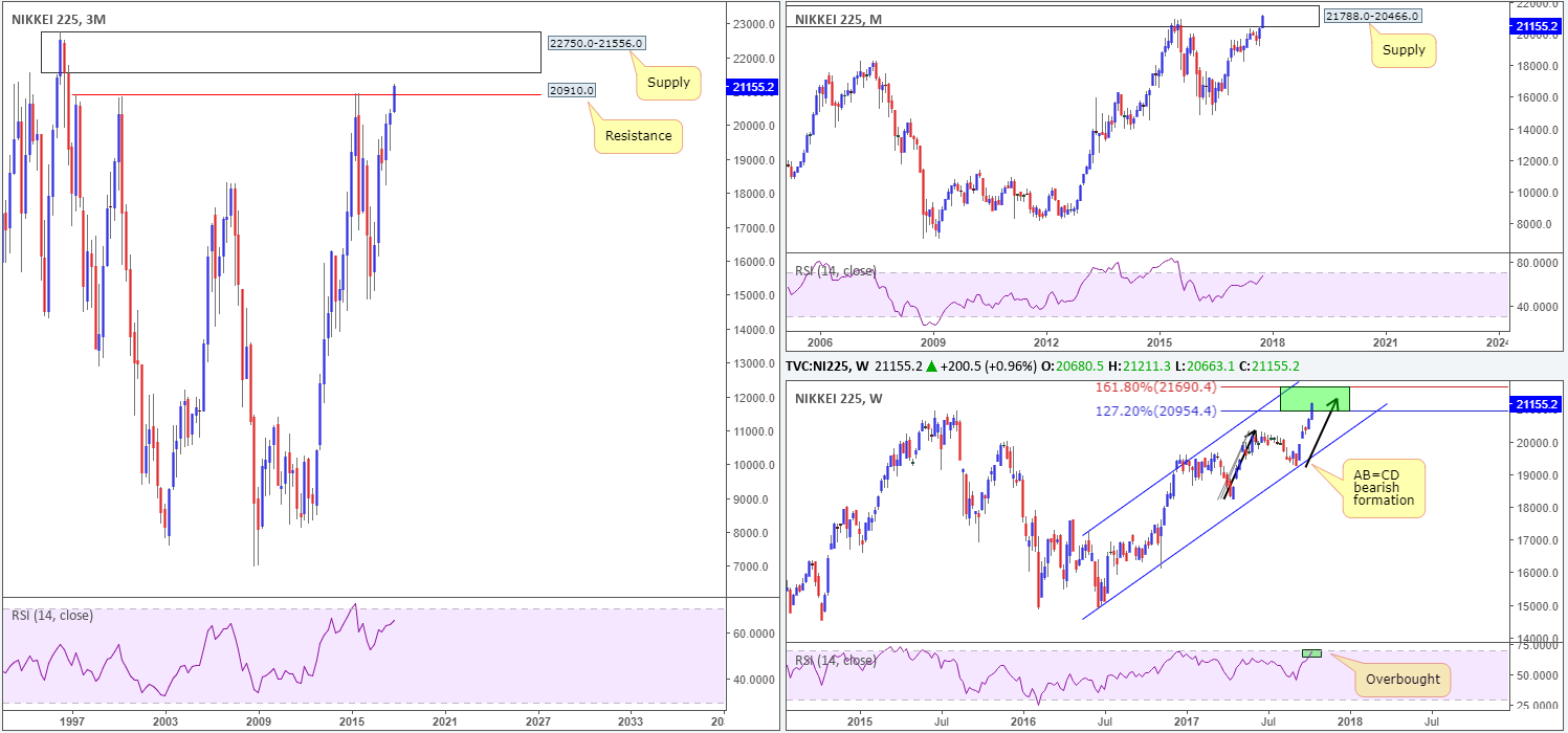 - Weekly action is currently trading within the confines of an AB=CD bearish reversal zone (green) at 21690.4-20954.4 taken from the low 18224.7, coupled with the RSI tapping the overbought 70.0 value.