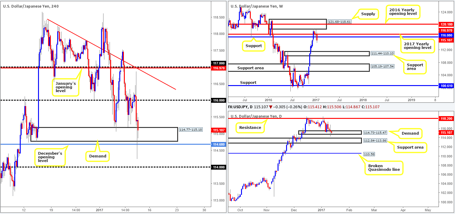 Fueled by Trump’s press conference yesterday, the USD/JPY sold off from highs of 116.87 and plunged to lows of 114.24 a few hours ahead of the close. H4 demand at 114.77-115.18 and December’s opening level at 114.86 both suffered a breach during the recent selloff. This begs the question, was this move enough to take out the sell stops below these areas? We believe it has severely weakened this region and has potentially opened up downside to the 114 handle.