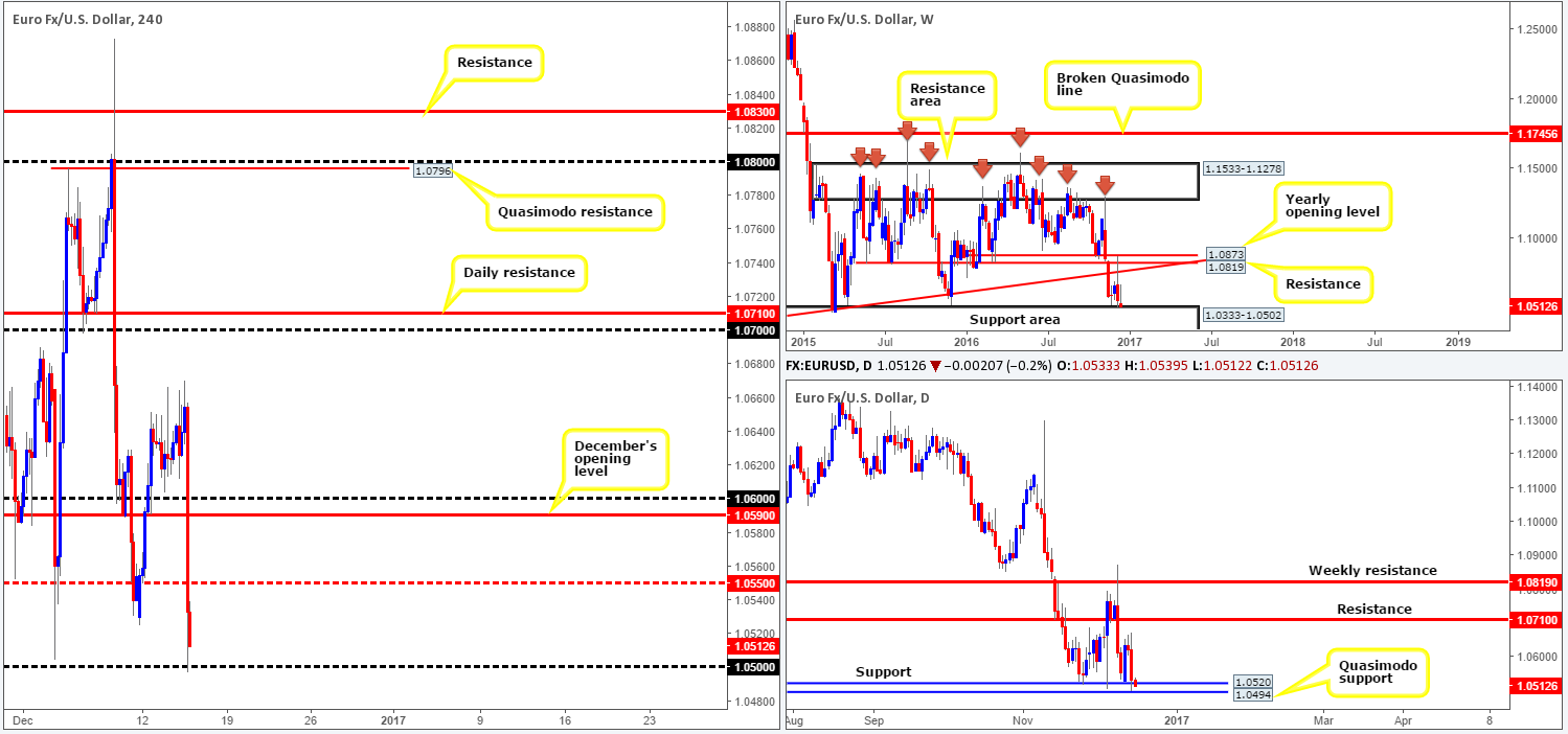 As anticipated, the FOMC decided to hike its target rate by 25bps yesterday. In consequence to this, the dollar advanced across the board and sent the shared currency aggressively lower. A number of H4 tech supports were engulfed during this bearish assault, with price concluding the day filling bids around the 1.05 handle.