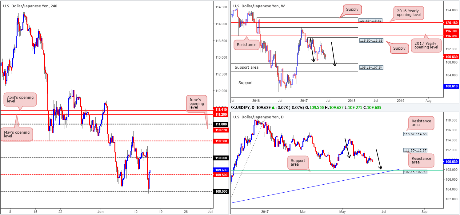 - Sells: Watch for H4 price to engulf 109.50 and then look to trade any retest seen thereafter ([waiting for a lower-timeframe sell signal to form following the retest – see the top of this report – is advised] stop loss: dependent on where one confirms this level).