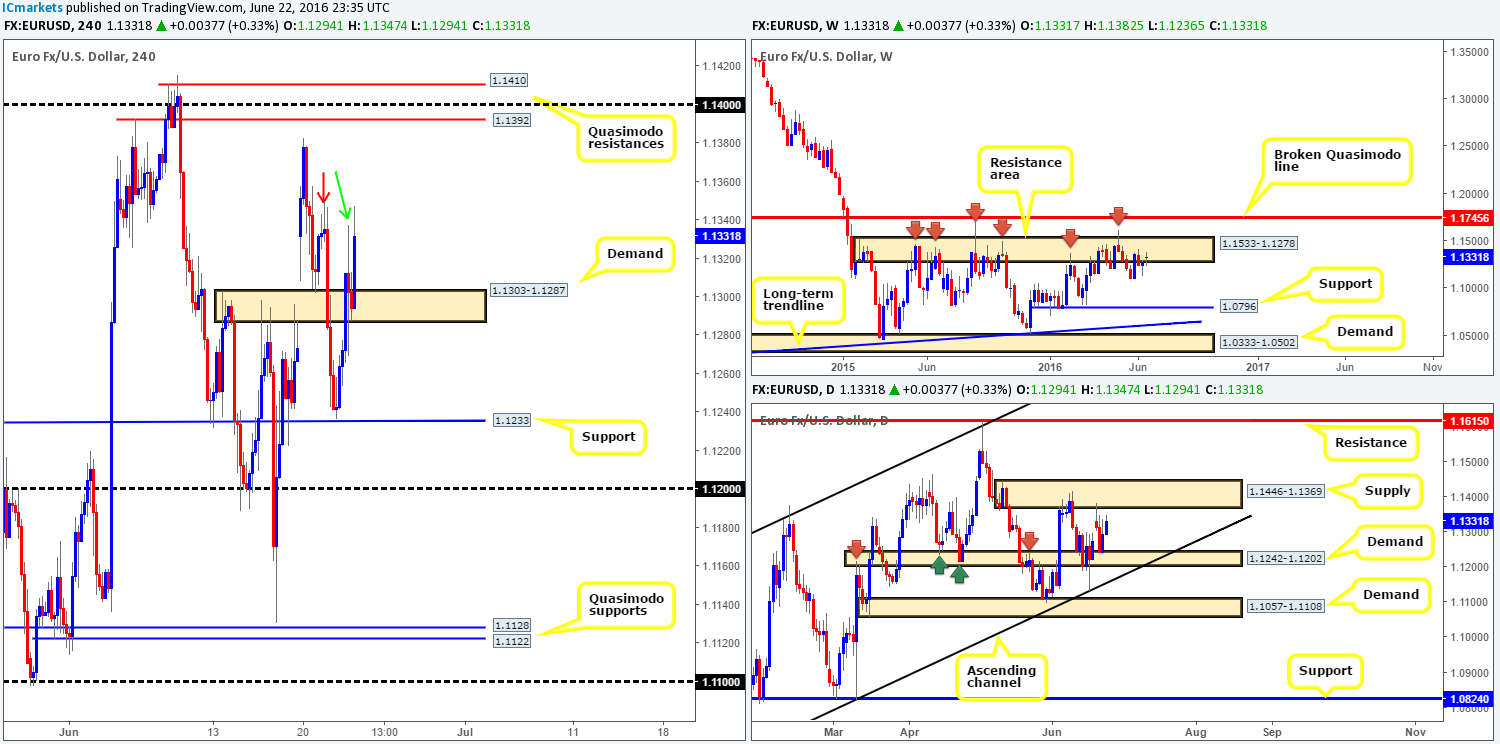 To our way of seeing things, the more concrete zone to be looking for trades is seen between 1.1410/1.1392. This area is formed by two H4 Quasimodo resistance lines, coupled with a psychological number lodged in between at 1.14. Additionally, it is also housed within both the aforementioned weekly and daily barriers (see above); therefore the chance of a bearish reversal from here is much greater in our opinion. Despite all of the above our team will, even if price strikes the 1.1410/1.1392 region today, likely pass on selling from here since price action is potentially going to be very ugly due to the UK voting taking place today.