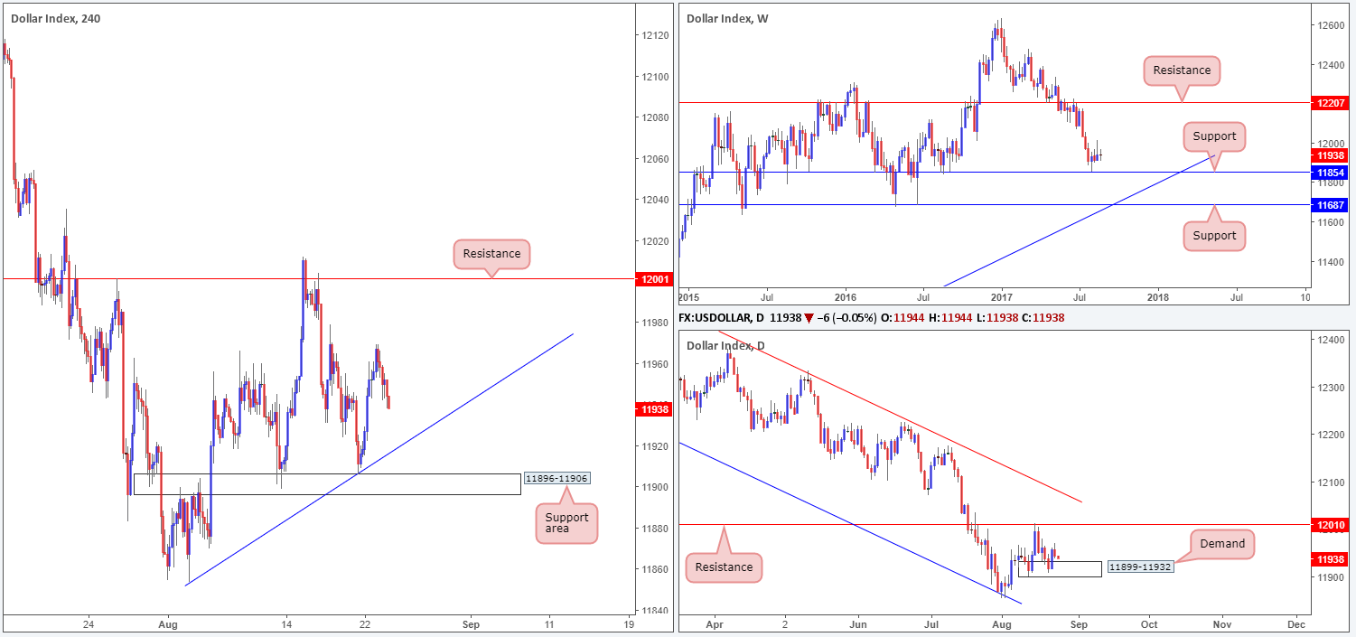 EUR buyers managed to find their feet early on in the day on Wednesday, bolstered by the H4 mid-level support at 1.1750. As a result of this, H4 price broke and eventually closed above the 1.18 handle. As you can see though, the unit failed to generate much follow through after this, due to a nearby Quasimodo resistance level at 1.1823 (shadowed closely by August’s opening level at 1.1830). However, considering that the USDX shows room for the H4 candles to push down as far as the trendline support extended from the low 11853, we may see the two noted H4 resistances give way sometime today.