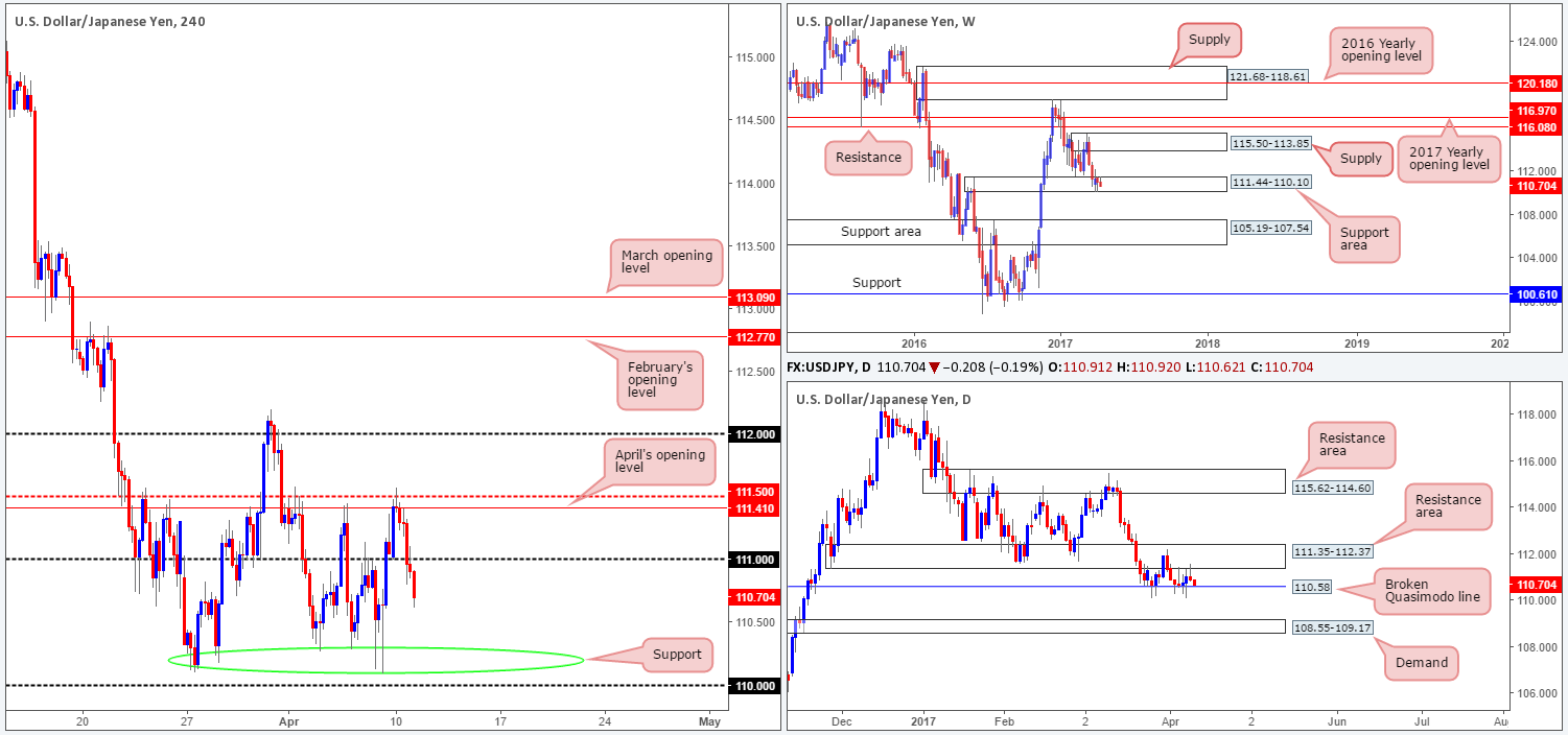 Although we have to agree the bears do look incredibly enthusiastic at the moment, it might be worth noting that there’s a weekly support area in play at 111.44-110.10 and also a daily broken Quasimodo line at 110.58! As such, we wouldn’t fancy being a seller in this market right now.