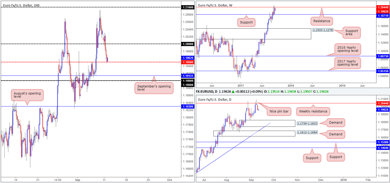 • Sells: Watch for H4 price to engulf 1.1950 and then look to trade any retest seen thereafter ([waiting for a lower-timeframe sell signal to present itself following the retest is advisable] stop loss: dependent on where one confirms the number).