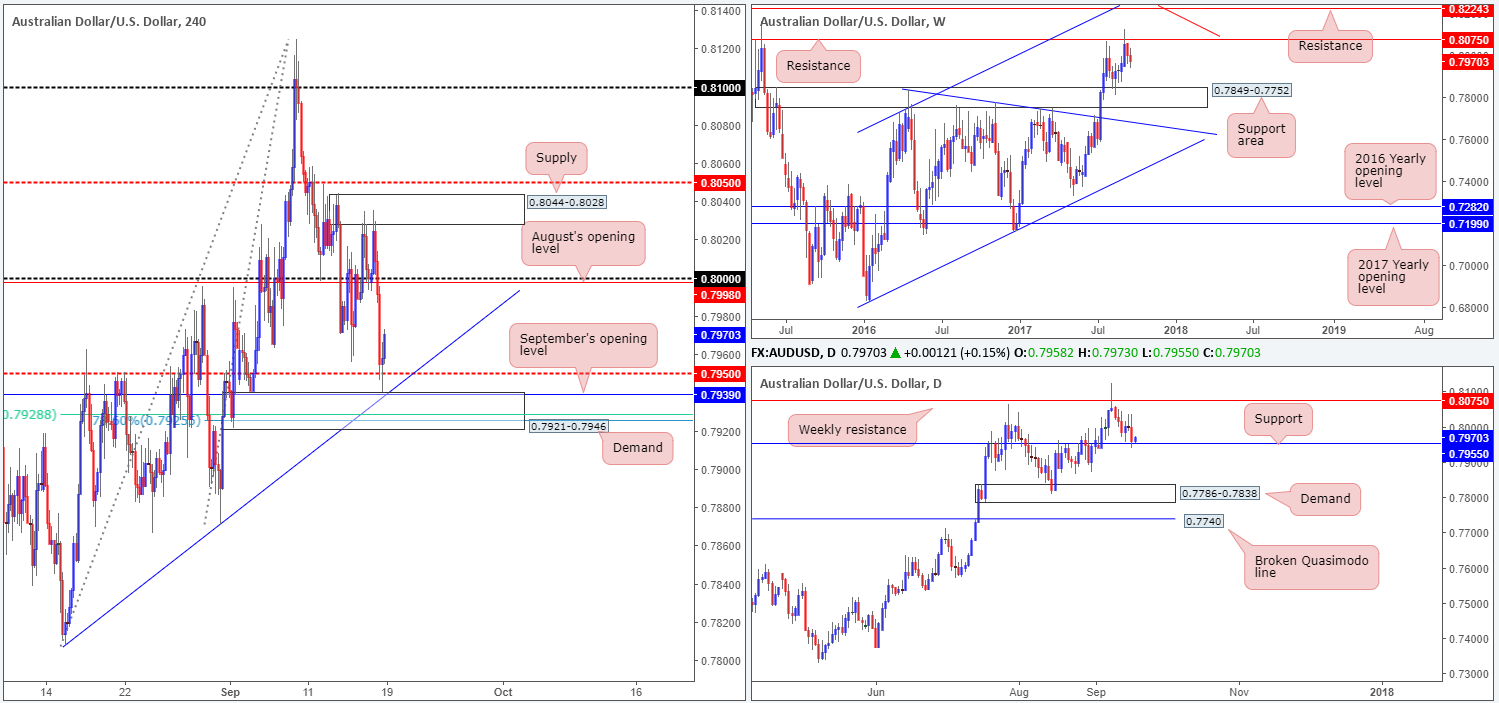 Across on the H4 timeframe, the large psychological level 0.80/August’s opening level at 0.7998 held firm in early trading, lifting price back up to supply at 0.8044-0.8028. It was from here though that things turned sour for the commodity currency as price stormed lower, breaking through 0.80 and the mid-level support at 0.7950, and coming within a pip of testing September’s opening level at 0.7939.