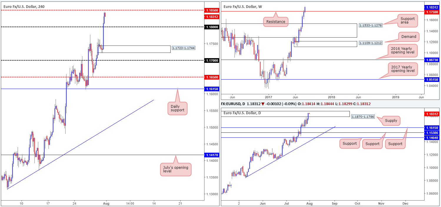 In recent trading, the single currency climbed to a high of 1.1845. The 1.18 handle was, as you can see, taken out with relative ease, allowing daily price to gravitate higher into the walls of supply coming in at 1.1870-1.1786. While this daily supply zone is considered strong, we are a tad anxious at the moment. Weekly price recently crossed above resistance at 1.1759, which could, if the bulls remain in a dominant position, further encourage buying up to a weekly resistance planted at 1.2044.