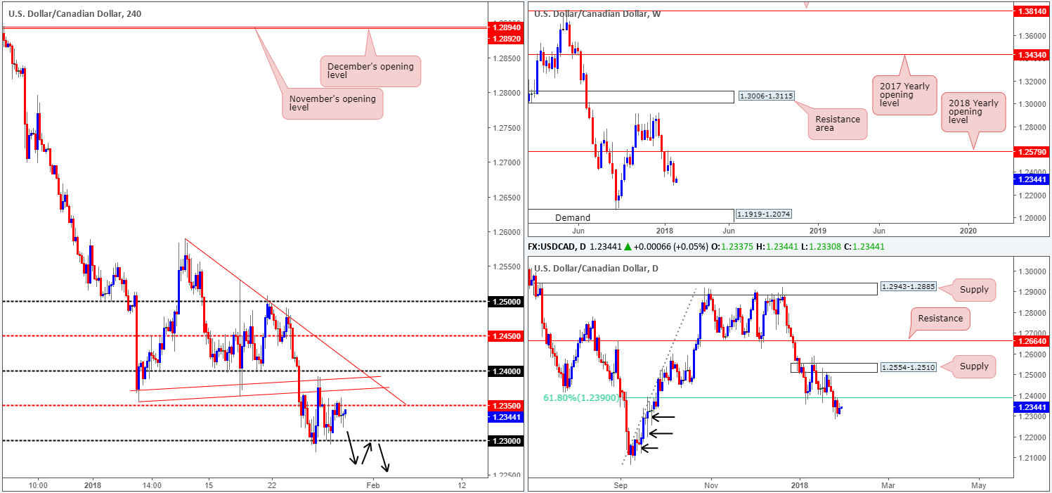 Supports: 1.23 handle; 1.2318; 1.2307; H4 trendline support; 1.2359; 1.2246-1.2164.