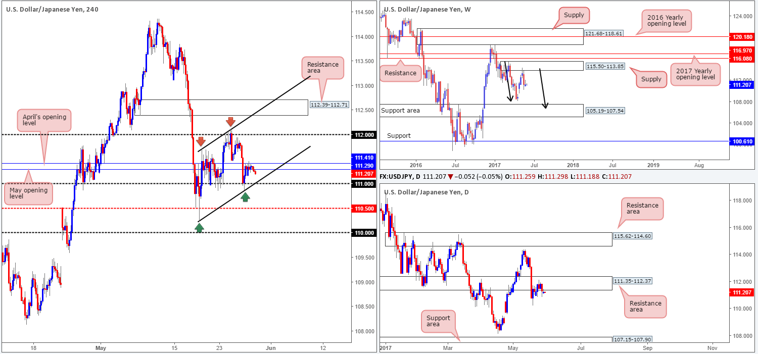 As can be seen from the H4 chart this morning, yesterday’s trading volume was thin due to US banks being closed in observance of Memorial Day. Despite this, May/April’s opening levels at 111.29/111.41 did a good job of holding back any fresh upside attempts. With little change seen to the structure of this market, much of the following report will echo similar thoughts put forward in Monday’s analysis…