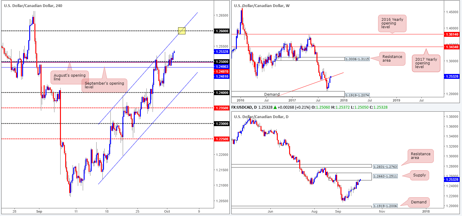 Reinforced by a robust US dollar and an upbeat US ISM Manufacturing PMI, the USD/CAD conquered the 1.25 handle on Monday and tapped a high of 1.2524 on the day. Although daily action resides within supply seen at 1.2663-1.2511 and weekly price at a trendline resistance extended from the low 0.9633, H4 price shows room to advance up to the 1.26 handle which happens to fuse beautifully with a channel resistance etched from the high 1.2338 (yellow rectangle).
