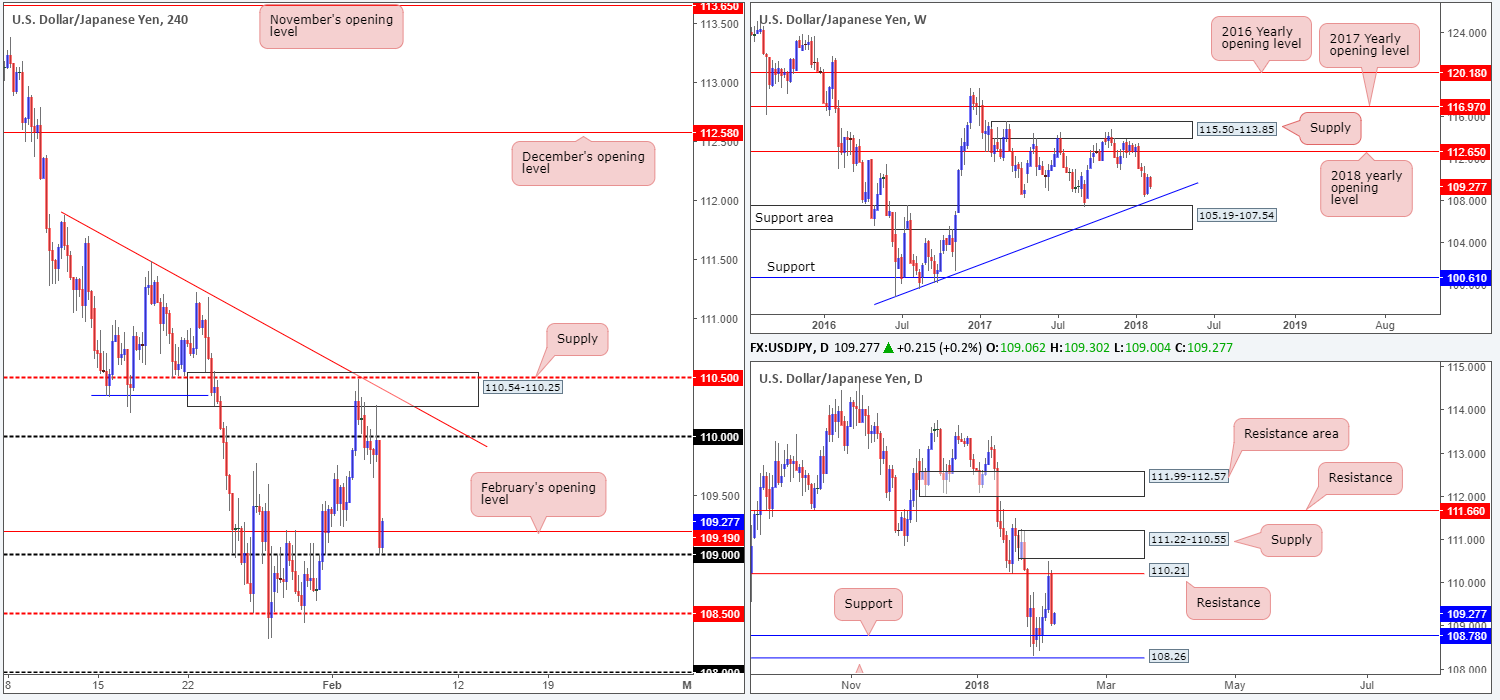 After failing to sustain gains above the 110 handle on the H4 timeframe (thanks largely to the H4 supply at 110.54-110.25 and daily resistance at 110.21), the pair aggressively dropped lower and surpassed February’s opening line at 109.19 and ended the day touching gloves with the 109 handle.