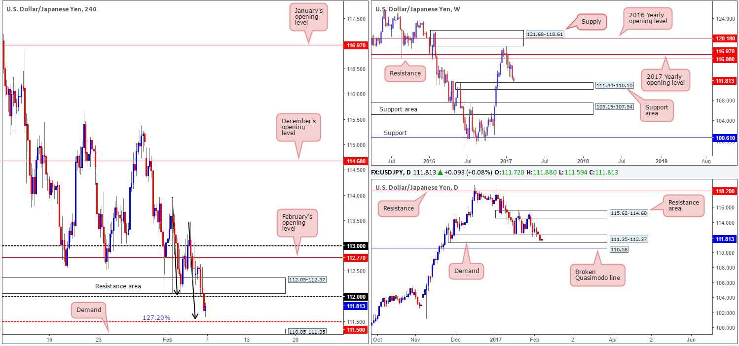 Kicking this morning’s report off with a quick look at the weekly chart, we can see that the current weekly candle is trading within touching distance of a weekly support area coming in at 111.44-110.10. Looking down to the daily chart, however, price is already seen trading within the walls of a daily demand area seen at 111.35-112.37. In the event that price does connect with the top edge of the weekly support area, there’s a chance that price could fakeout below the current daily demand to test the nearby daily broken Quasimodo line at 110.58.