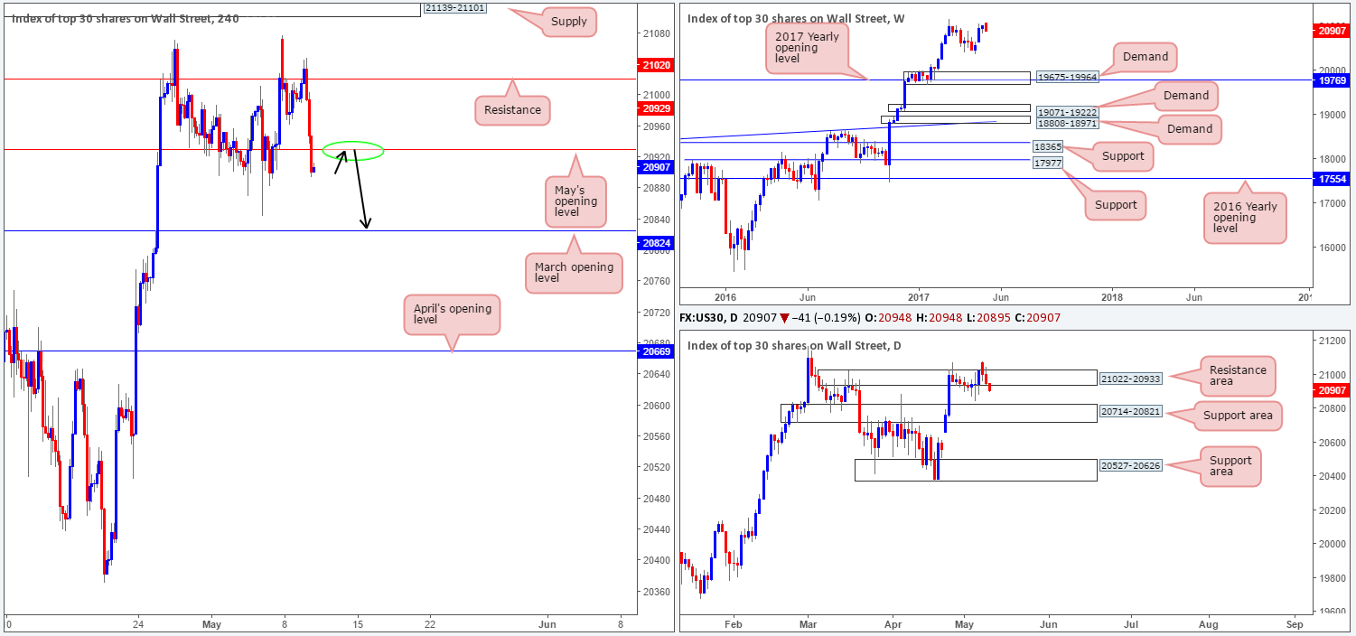 Our suggestions: Given the above information, we’re going to be looking for a reasonably sized H4 bear candle to form off May’s opening level today. In the event that this comes to fruition, we’ll look to short and target March’s opening level.