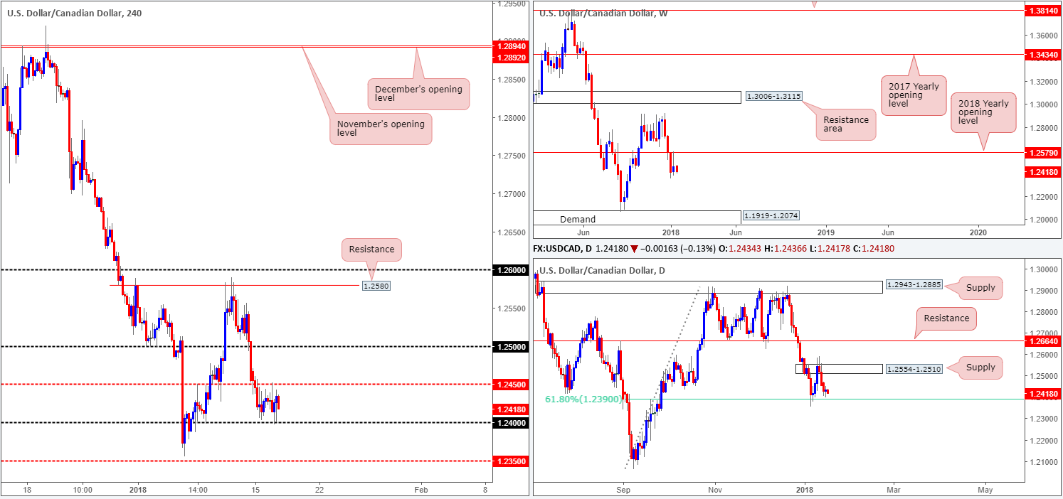 In spite of weekly price suggesting further downside, the 1.24 handle on the H4 timeframe and aforementioned daily 61.8% Fib support will likely be tough nut to crack. Does this mean a buy could be in order? Not necessarily. A long would also place one in direct conflict with the 1.2450 number on the H4 timeframe, and against potential weekly flow.