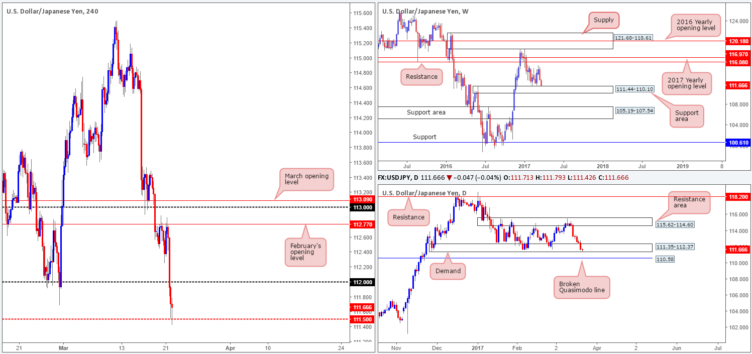 With US equity prices falling sharply yesterday, this, as you can see, revived demand for the safe-have yen! H4 price staged a rather aggressive selloff from the underside of February’s opening line at 112.77, consequently breaching the 112 handle and slam dunking itself into the H4 mid-way support barrier at 111.50 at the close. Whilst 111.50 is a support in and of itself, we would not consider it stable enough to justify a long. But, knowing that this number is placed within the walls of a daily support area at 111.35-112.37 along with weekly price skimming the top edge of a weekly support area at 111.44-110.10, the 111.50 level becomes a worthy contender as far as supports go.