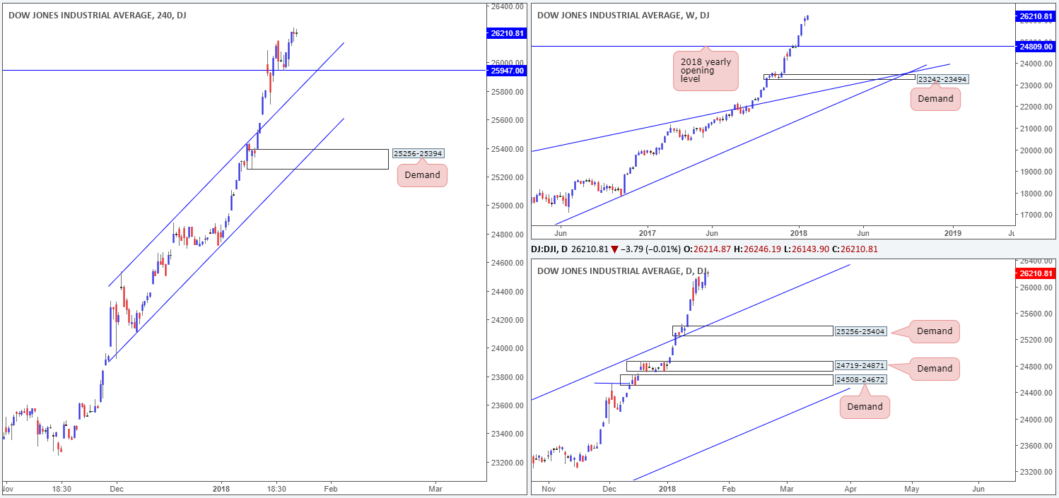 Following Monday’s advance, the US equity market, although fresh record highs of 26246 were achieved, was reasonably subdued on Tuesday, forming two back-to-back H4 indecision candles. With this being the case, much of the following report will echo thoughts put forward in Tuesday’s report…