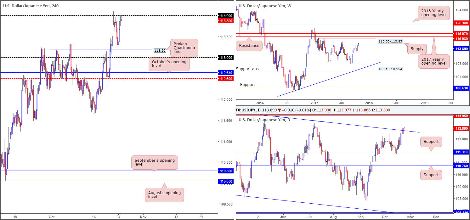 Jumping across to the H4 timeframe, it’s clear to see that the 114 handle is back in the fray. Despite an earnest attempt to push lower from here on Tuesday, however, the bulls proved to be resilient.