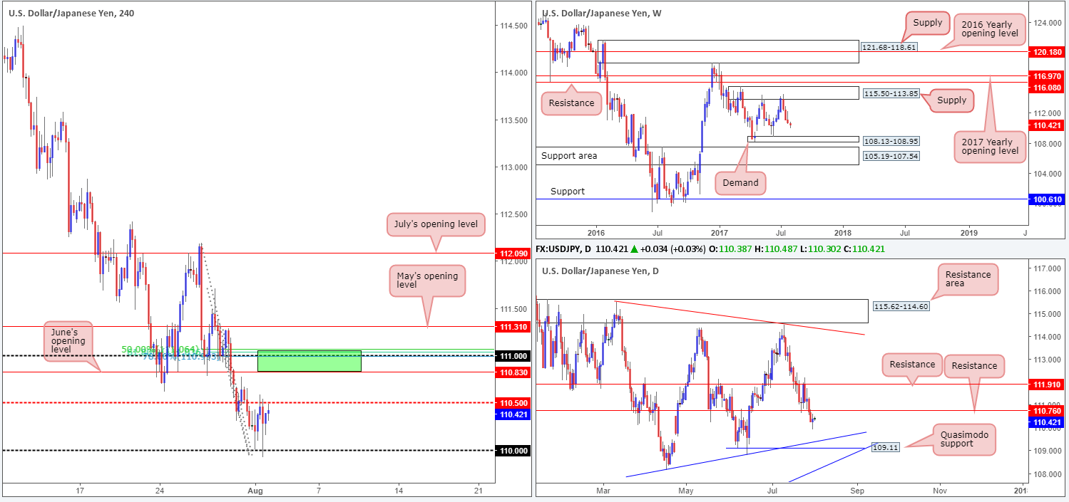 Our suggestions: With the higher-timeframe picture suggesting that further selling could be on the cards, we have our eye on the 111 handle today. This number – coupled with a nice-looking H4 Fibonacci resistance cluster (50.0%/61.8%/78.6% taken from the highs 112.19/111.71/111.28) and June’s opening level at 110.83, makes for a strong-looking sell base (green zone).